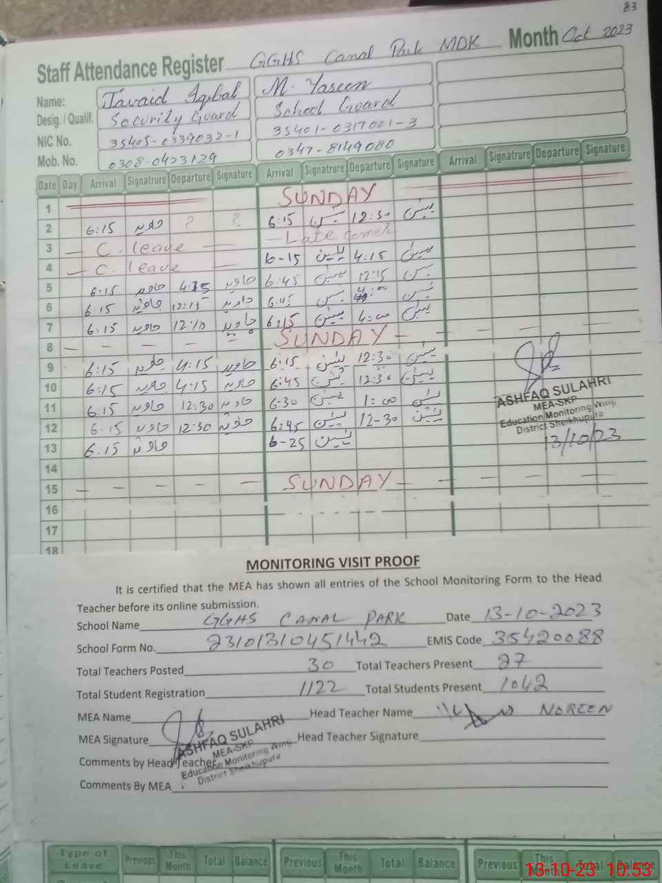 | Monitoring Date: 13-10-2023 | Start Time: 13-10-2023 07:45 AM | End Time: 13-10-2023 10:56 AM | Name of MEA: Mu**** As**** | |