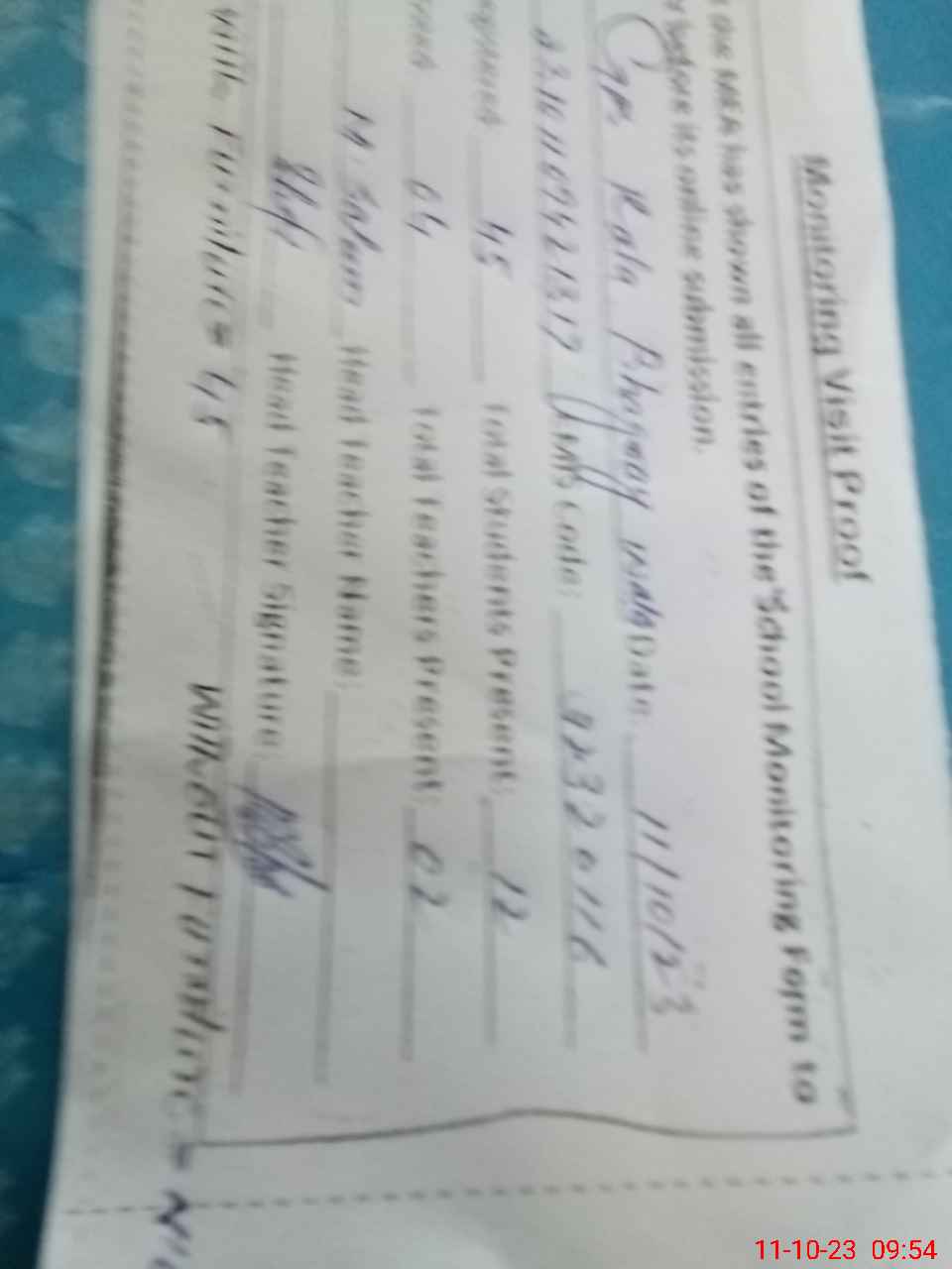 | Attendance Register | Head Teacher | MEA with School | Visit Proof |