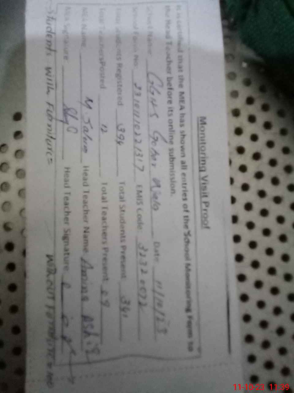 | Certified that this School was Inspected by the Undersigned MEA/DMO Today and the Information Stated Above is as Per Record. | |||||