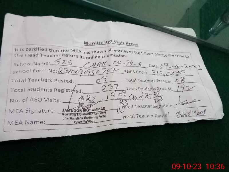 | EMIS Code: 31310039 | Name of School: GES CHAK NO 74/A FEROZA | |||
