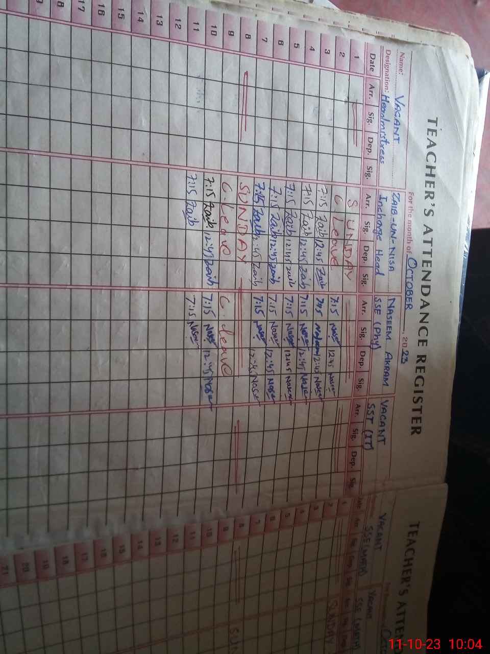 | CNIC | Full Name | Designation | R/C | Absence During Last Calender Month |
