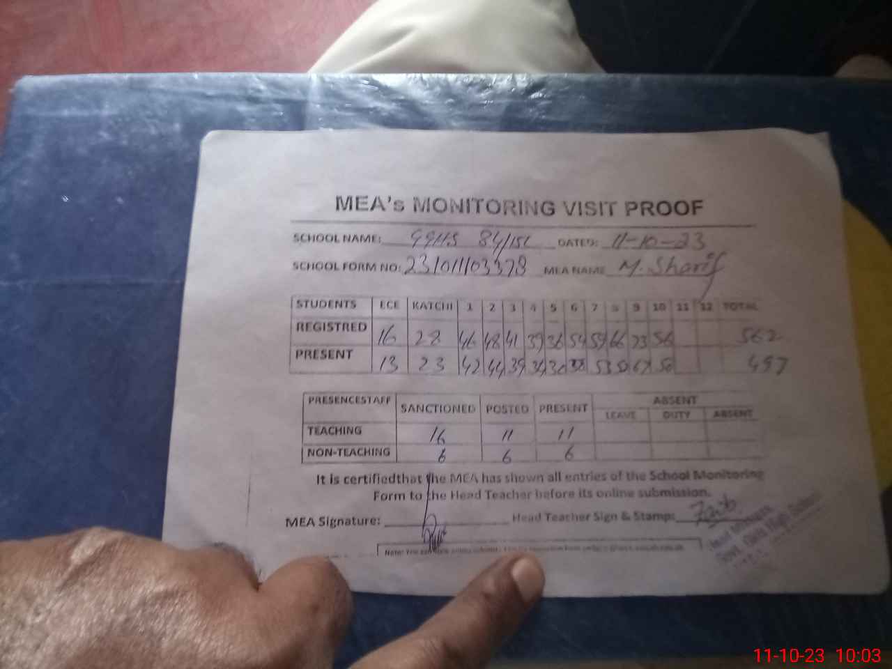 | Attendance Register | Head Teacher | MEA with School | Visit Proof |