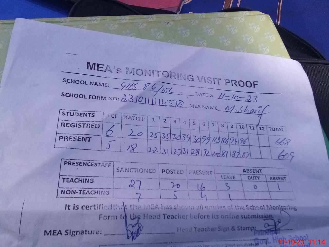 | Certified that this School was Inspected by the Undersigned MEA/DMO Today and the Information Stated Above is as Per Record. | |||||