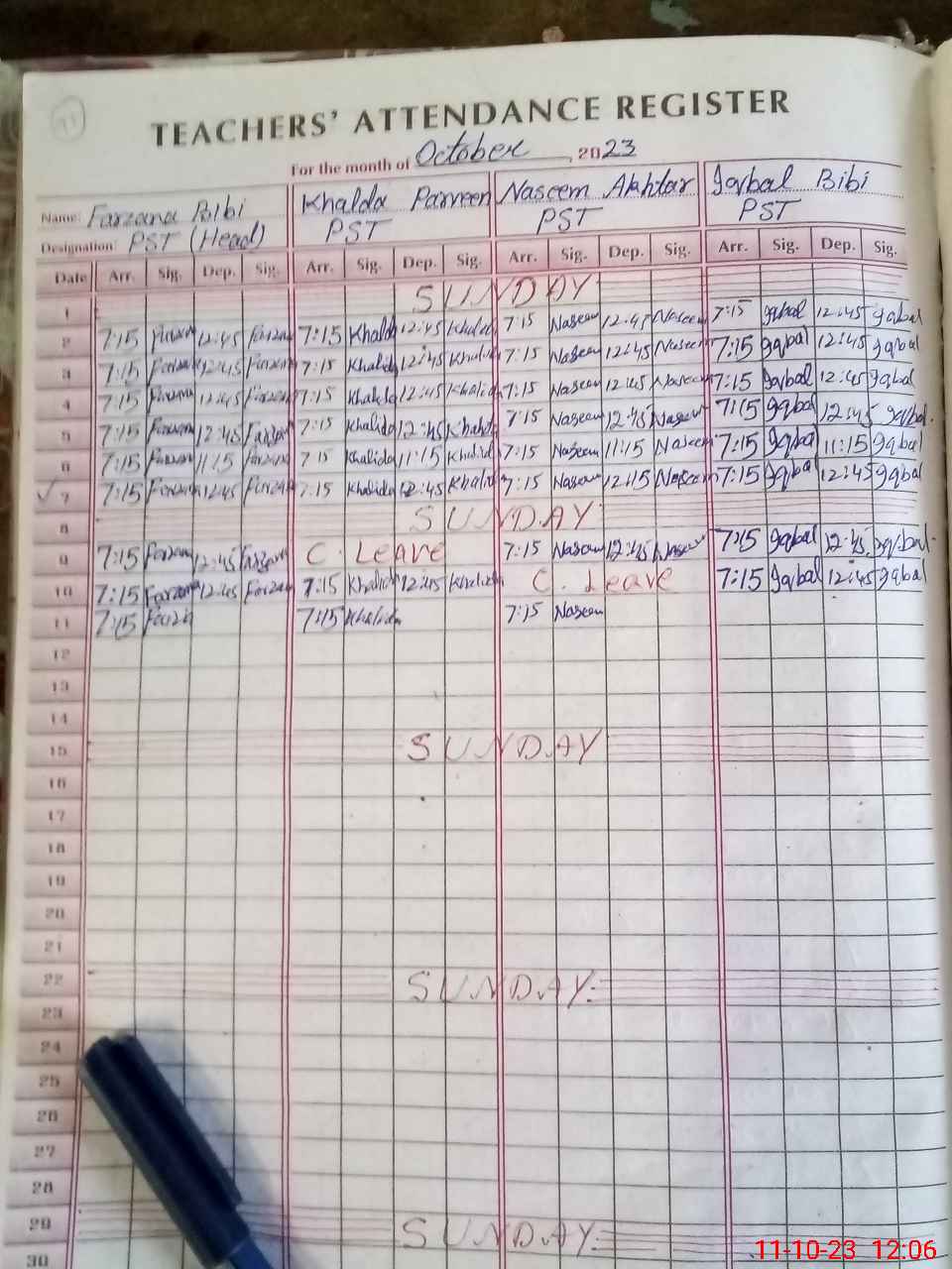 | CNIC | Full Name | Designation | R/C | Absence During Last Calender Month |