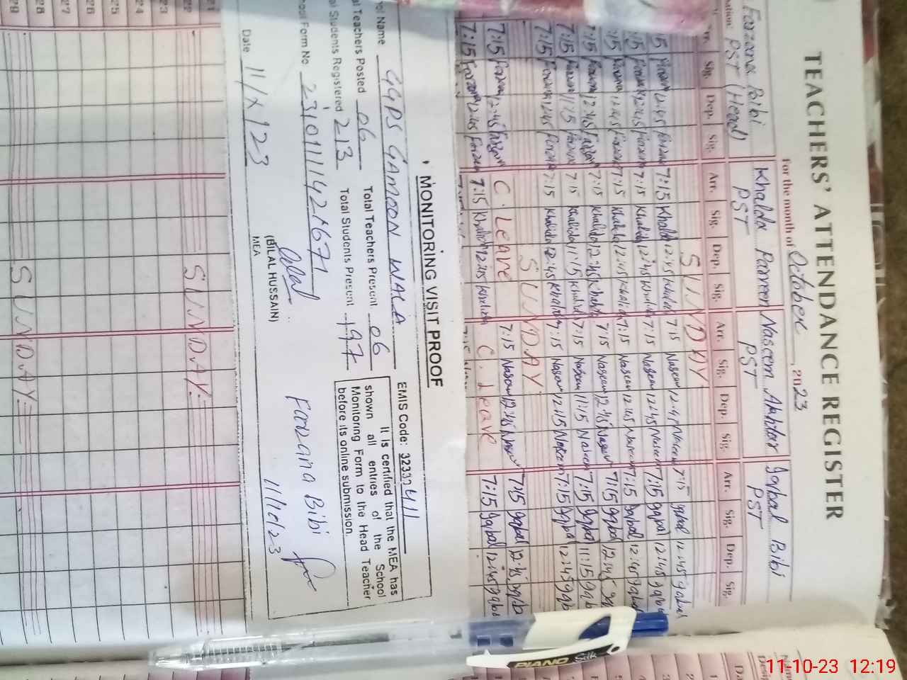 | Attendance Register | Head Teacher | MEA with School | Visit Proof |