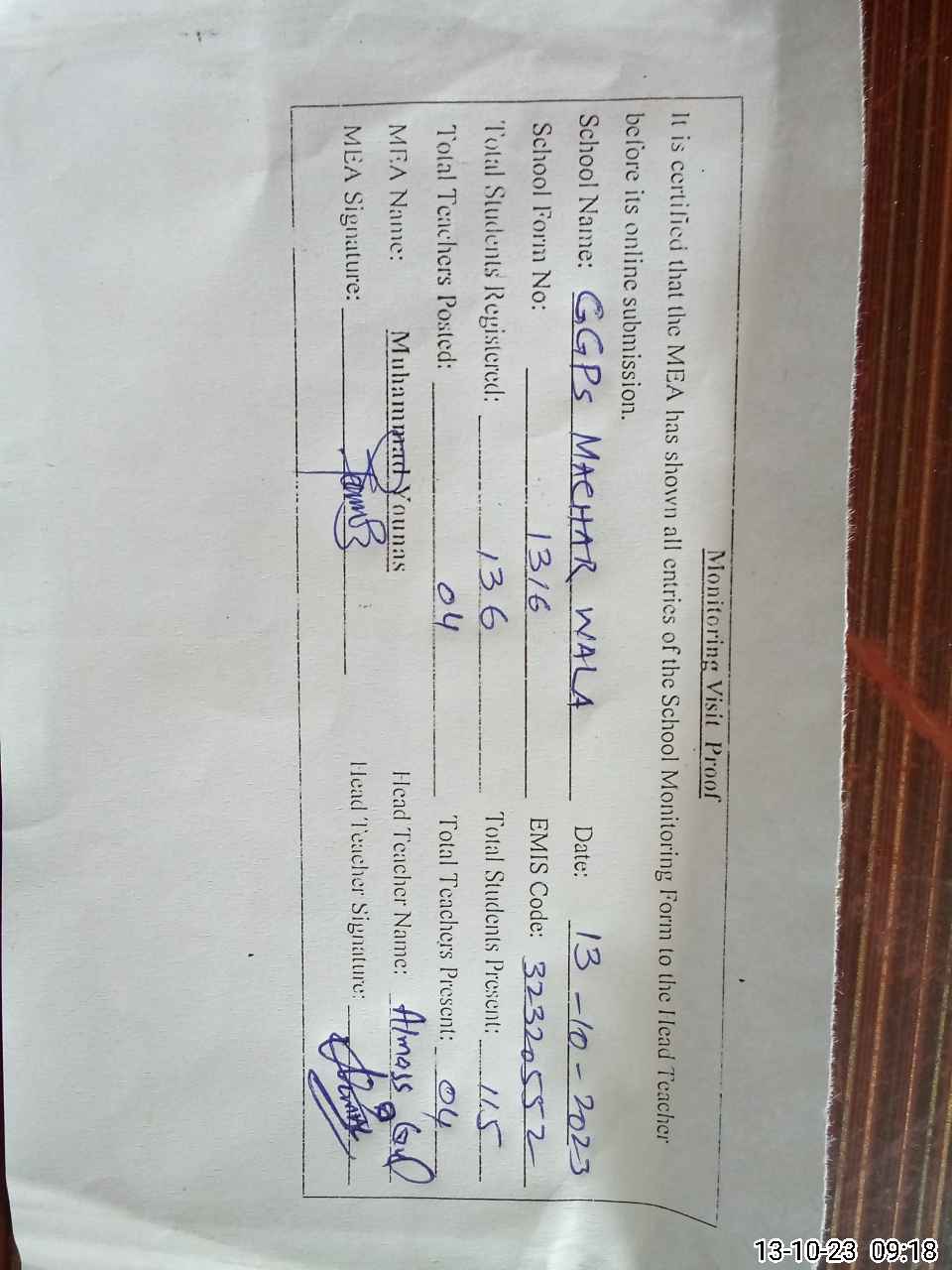 | Attendance Register | Head Teacher | MEA with School | Visit Proof |
