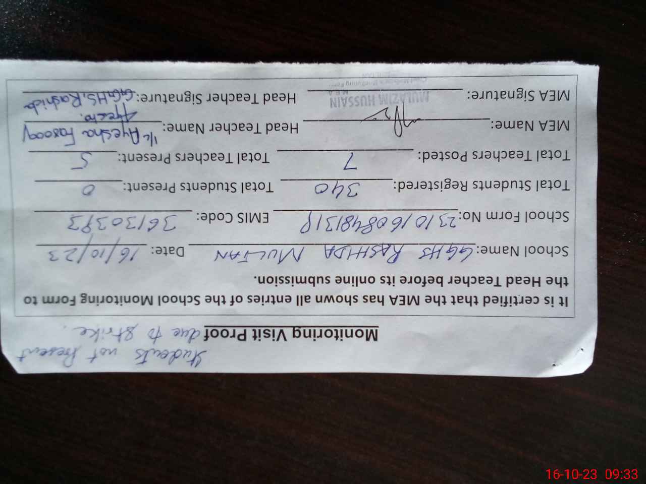 | Attendance Register | Head Teacher | MEA with School | Visit Proof |