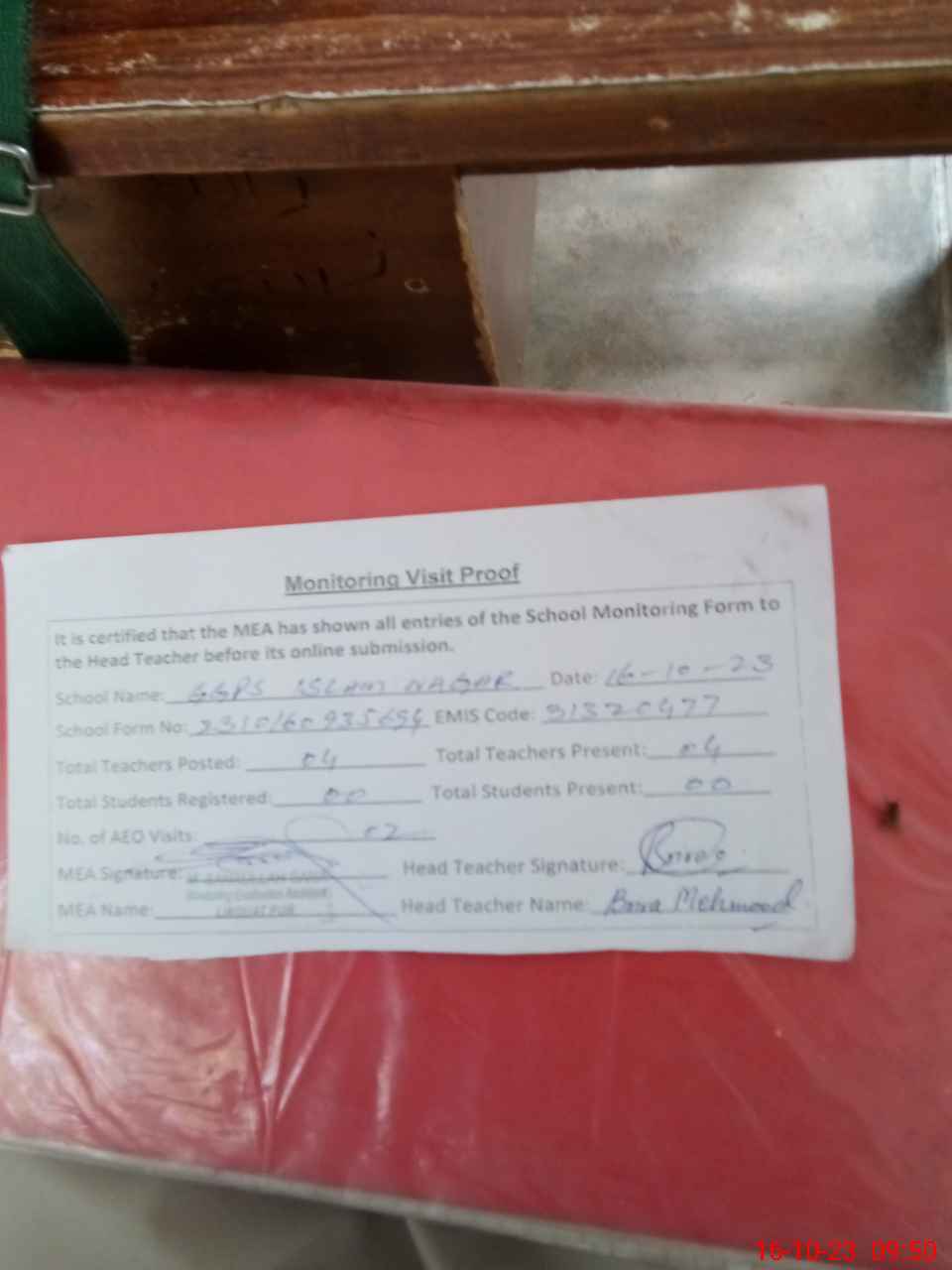 | Attendance Register | Head Teacher | MEA with School | Visit Proof |