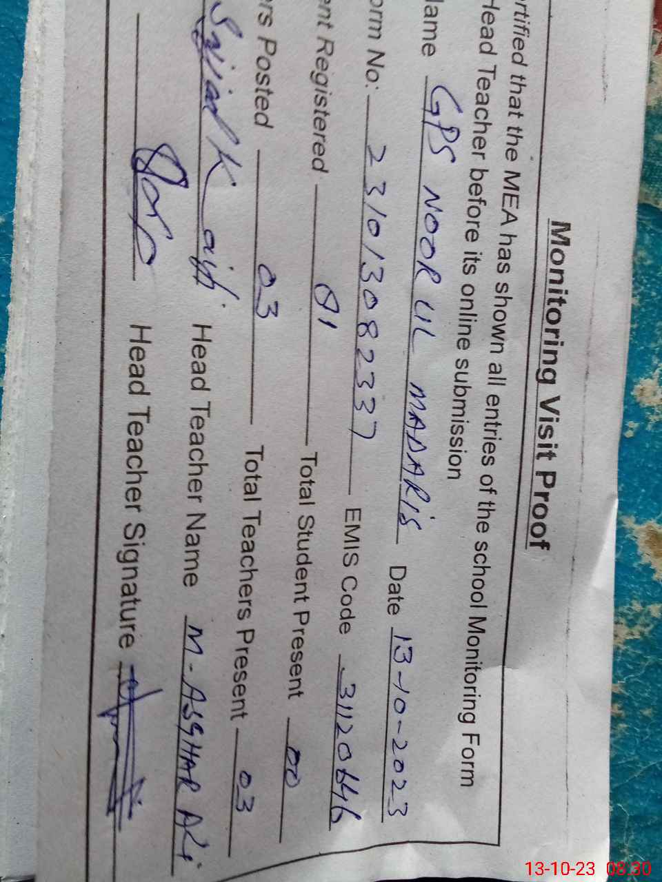 | EMIS Code: 31120646 | Name of School: GPS NOOR UL MADARSS | |||