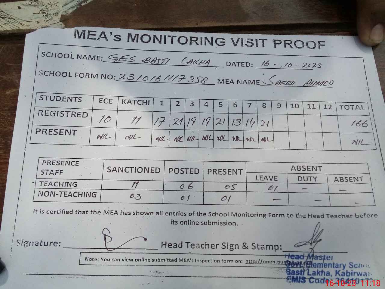 | Attendance Register | Head Teacher | MEA with School | Visit Proof |