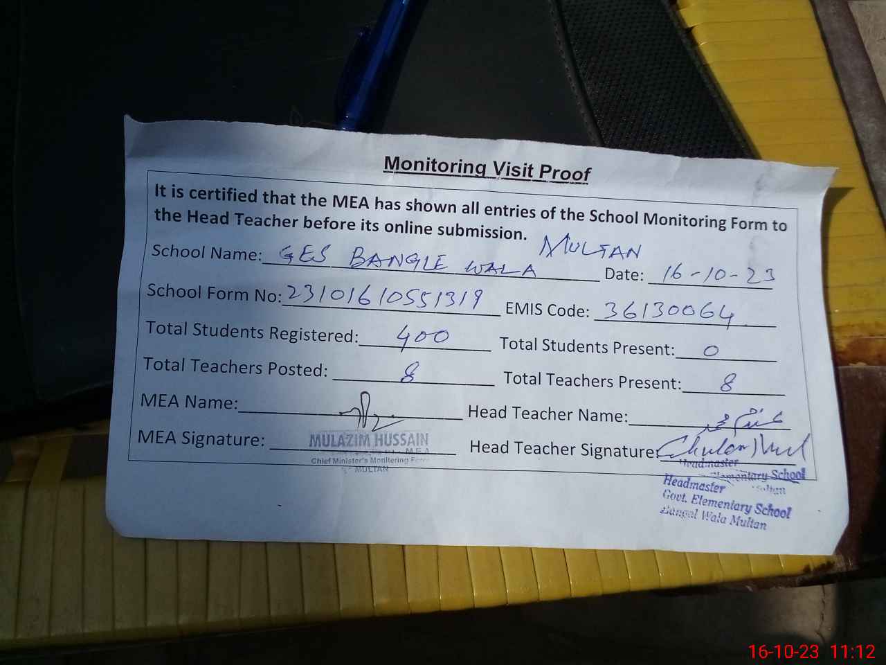 | Attendance Register | Head Teacher | MEA with School | Visit Proof |