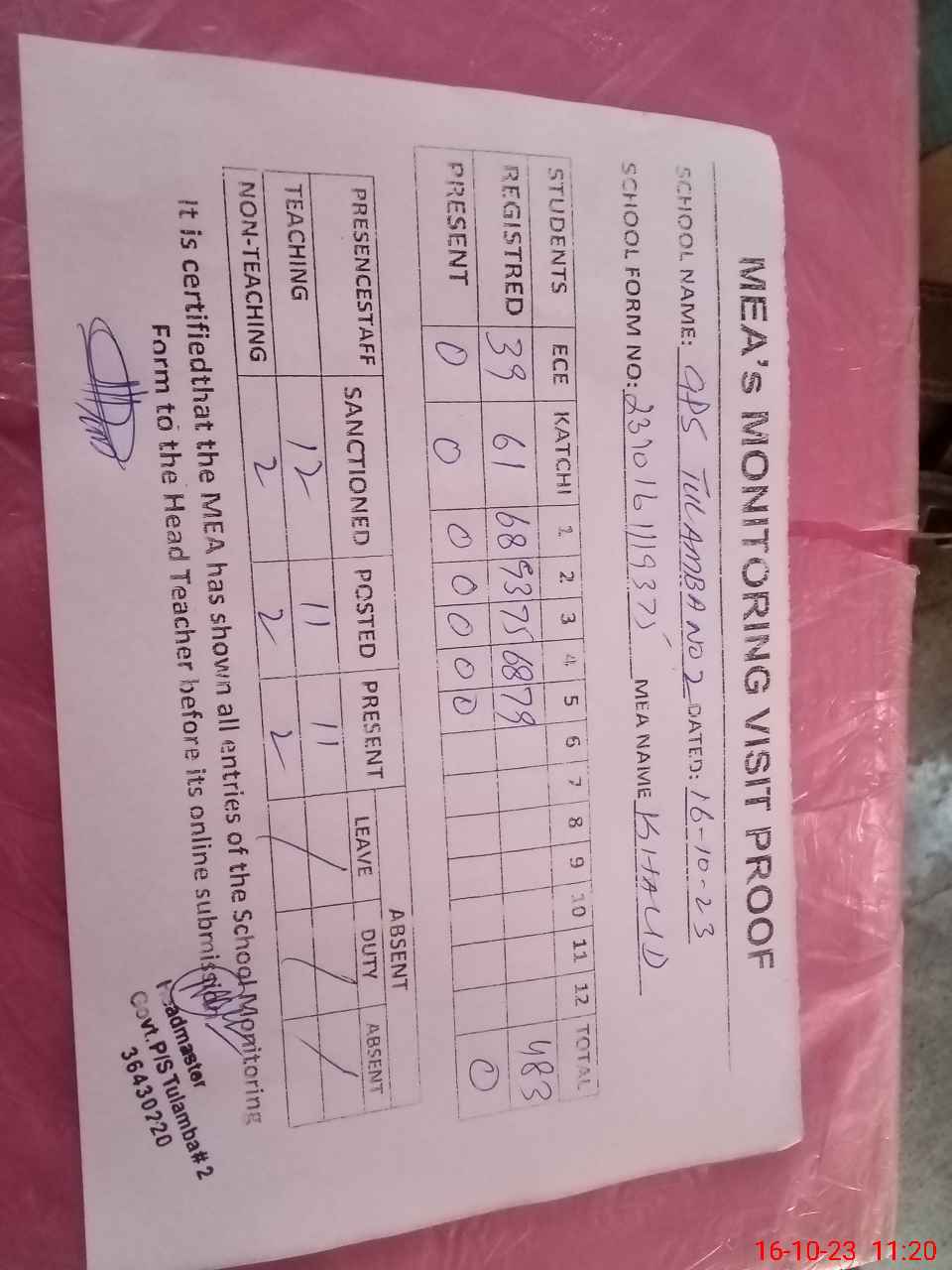| Attendance Register | Head Teacher | MEA with School | Visit Proof |