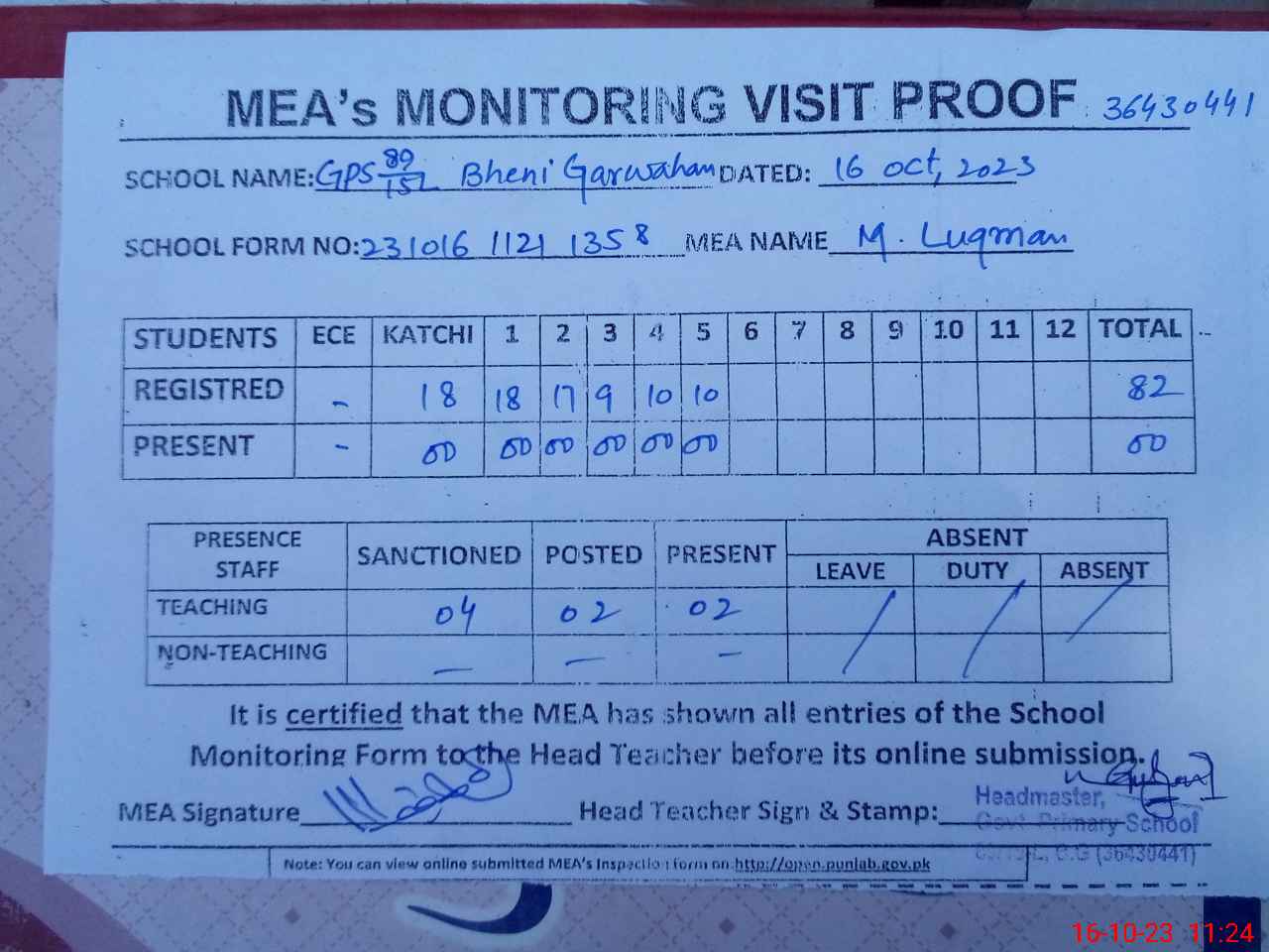 | Attendance Register | Head Teacher | MEA with School | Visit Proof |