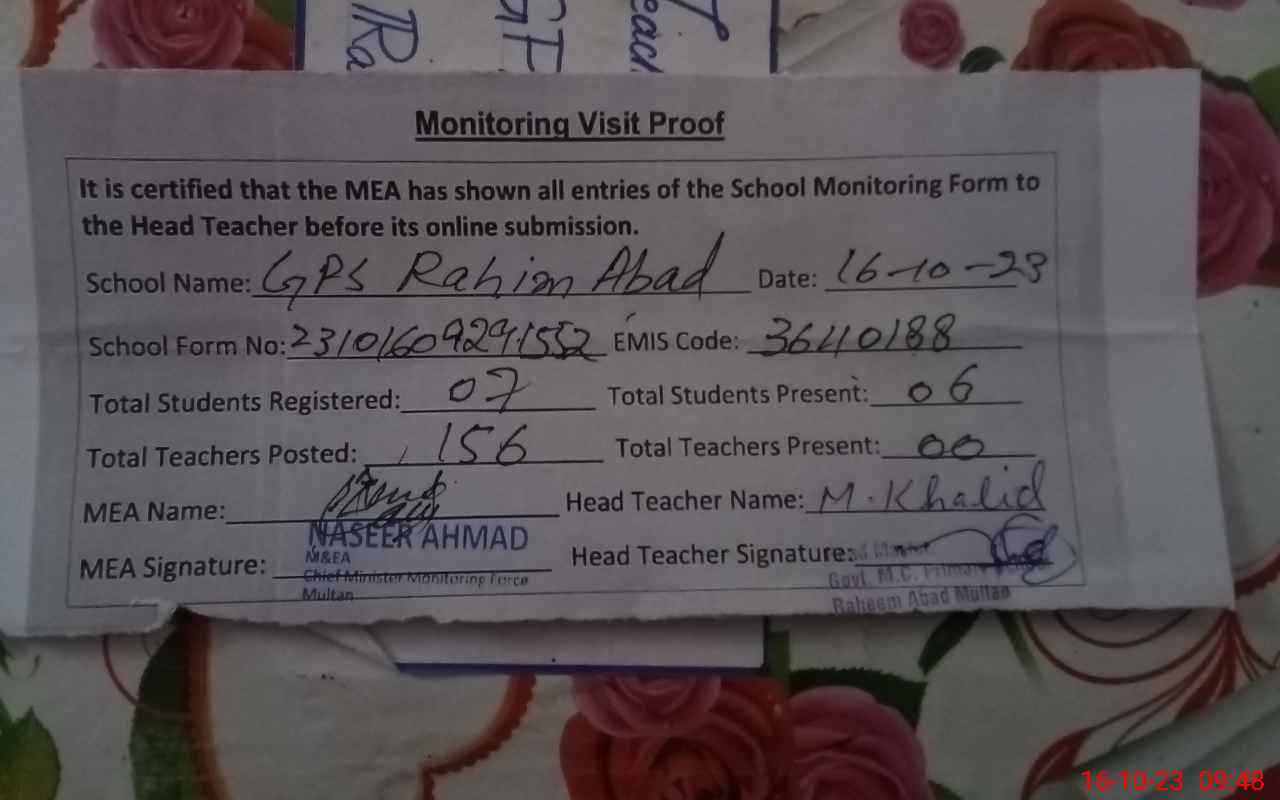 | EMIS Code: 36110188 | Name of School: GPS MC RAHIMABAD MULTAN | |||