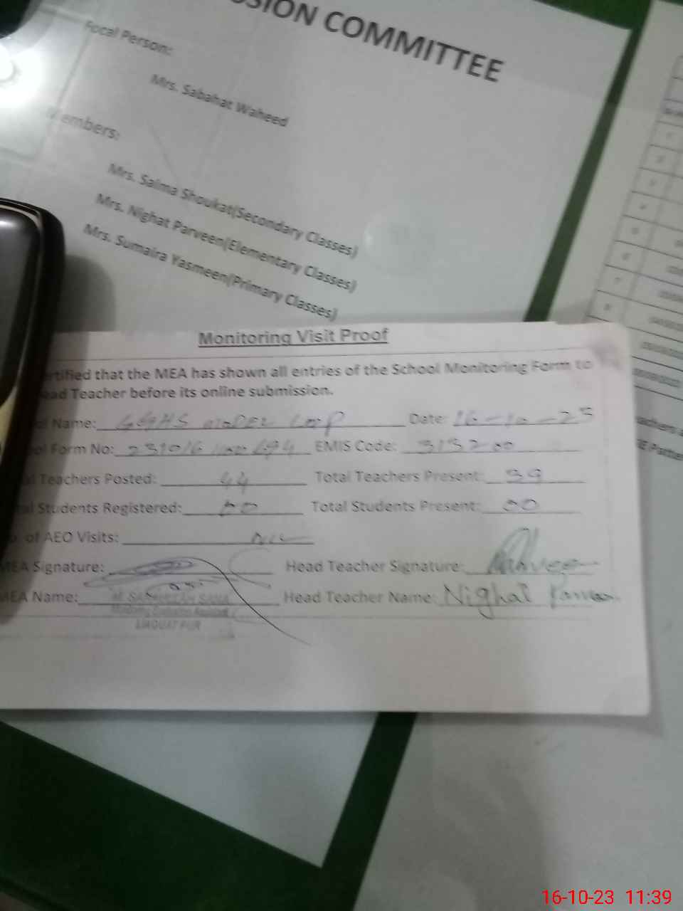 | Monitoring Date: 16-10-2023 | Start Time: 16-10-2023 11:00 AM | End Time: 16-10-2023 11:39 AM | Name of MEA: Mu**** Sa**** Ul**** Sa**** | |