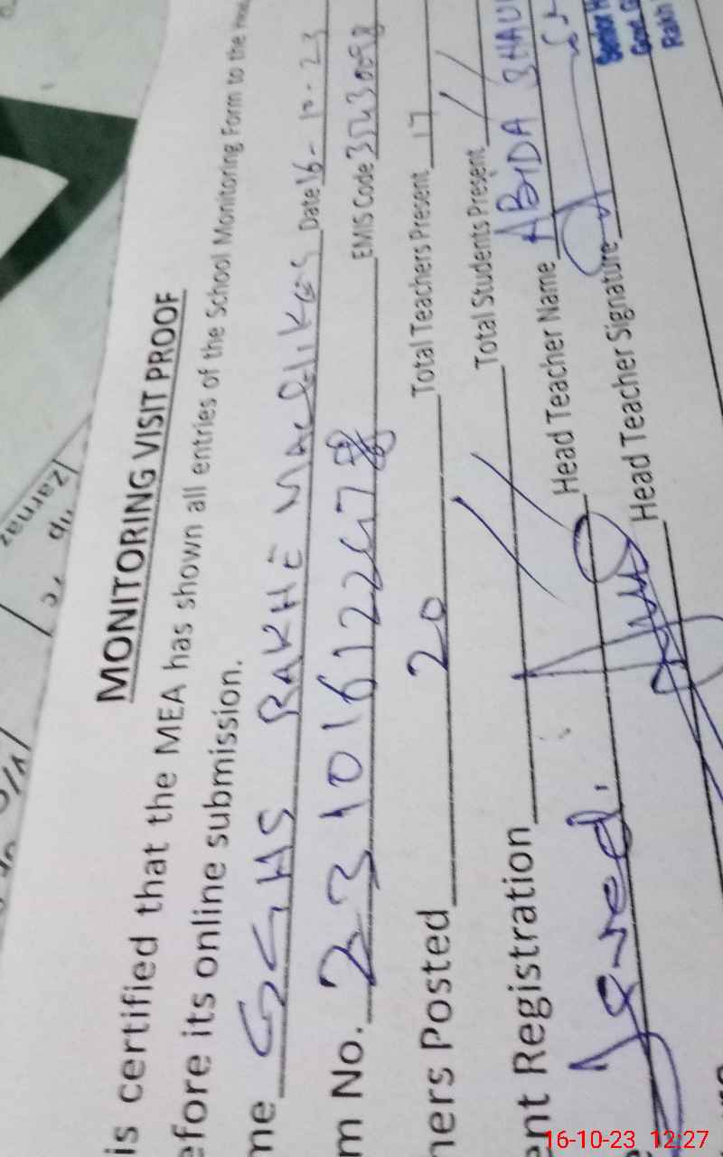 | Attendance Register | Head Teacher | MEA with School | Visit Proof |