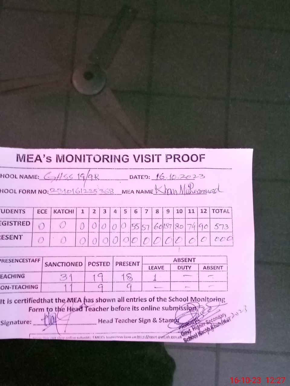 | Attendance Register | Head Teacher | MEA with School | Visit Proof |