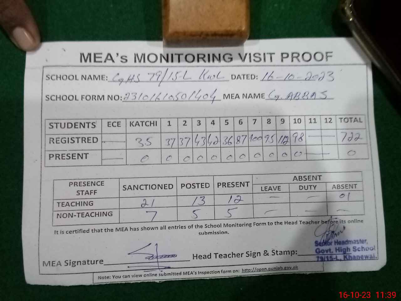 | Certified that this School was Inspected by the Undersigned MEA/DMO Today and the Information Stated Above is as Per Record. | |||||