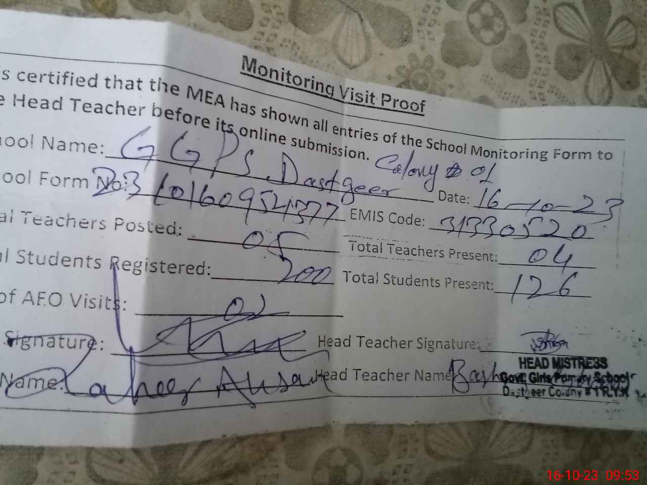 | EMIS Code: 31330520 | Name of School: GGPS DASTGEER COLONY NO. 1 | |||