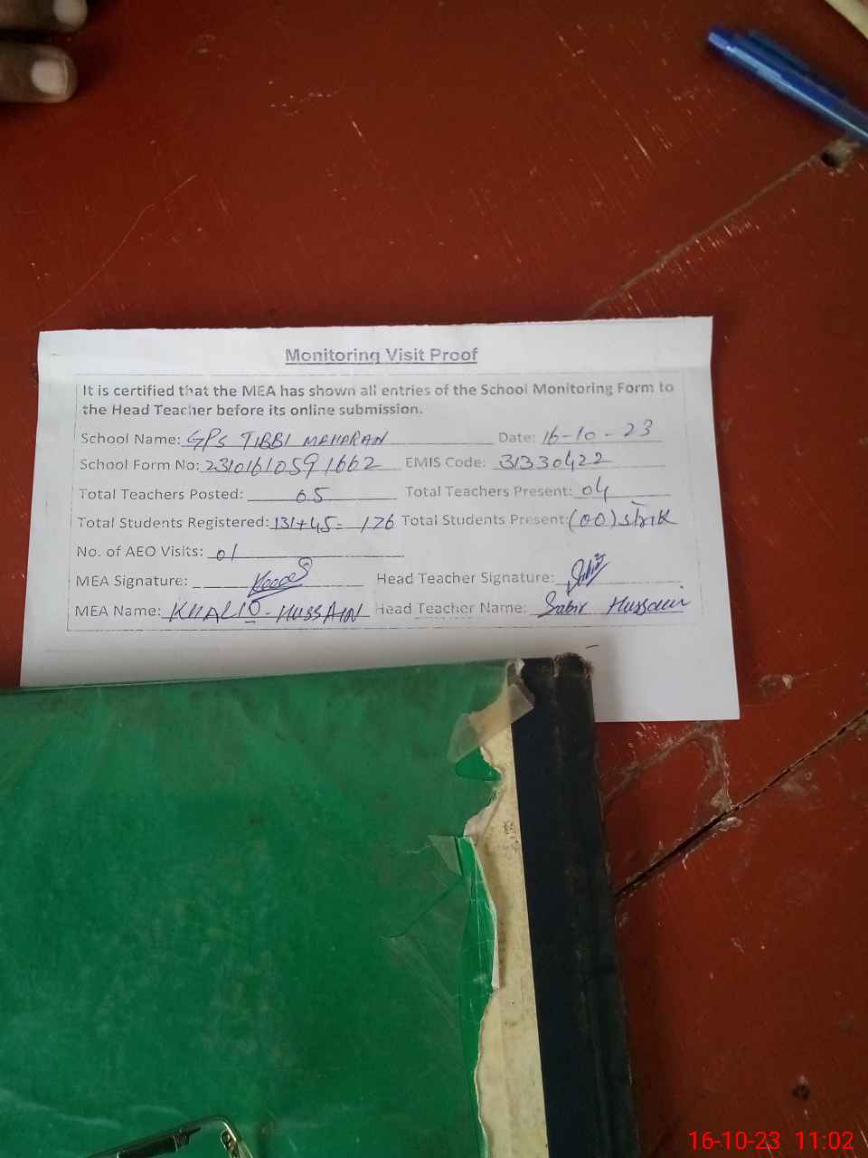 | Attendance Register | Head Teacher | MEA with School | Visit Proof |
