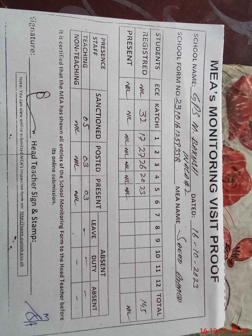 | Attendance Register | Head Teacher | MEA with School | Visit Proof |