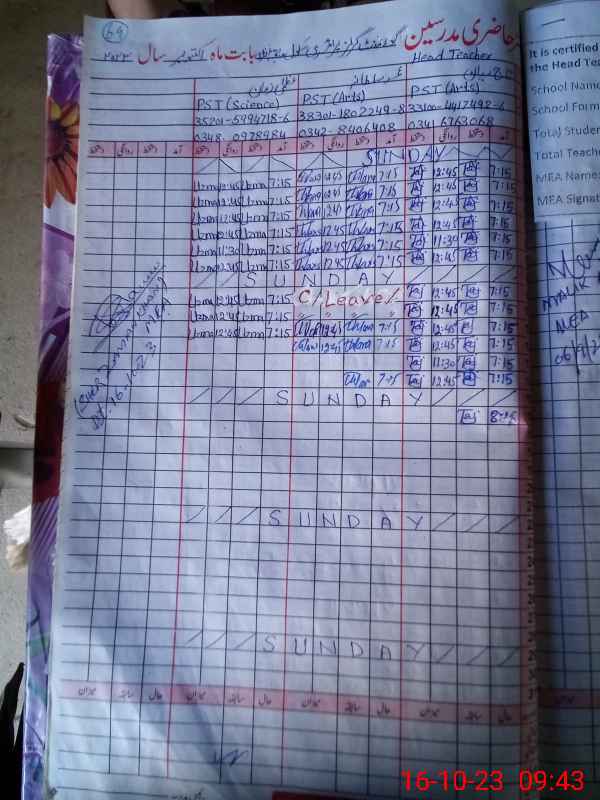 | Total no. of Classrooms: 3 No. of Classrooms Used for Teaching: 3 No. of Classrooms Storing Old Furniture, FTBs, etc: 0Comments if Any: PST UMAR SULTANA and Uzma Zaman was found absent there leave record was not shown to MEA and AEO FARHAT HASHMI was not visited the school and there was no students of class 3 |