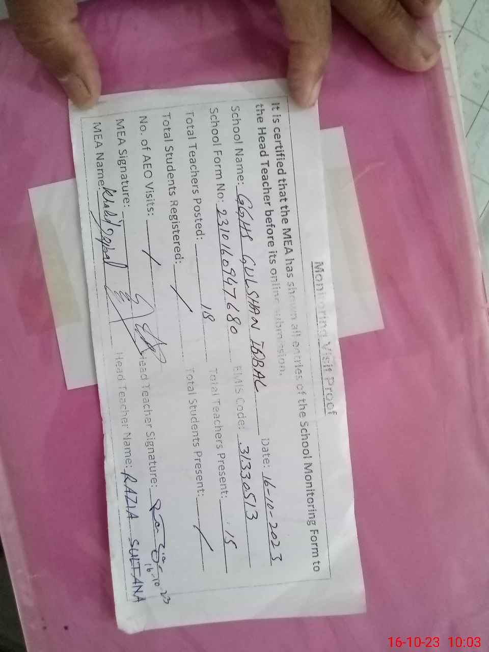 | Remarks (Use Separate Page if Required): Miss Razia Sultana in charge teacher provide only teacher details rest all information not provided due to protest | |||||
