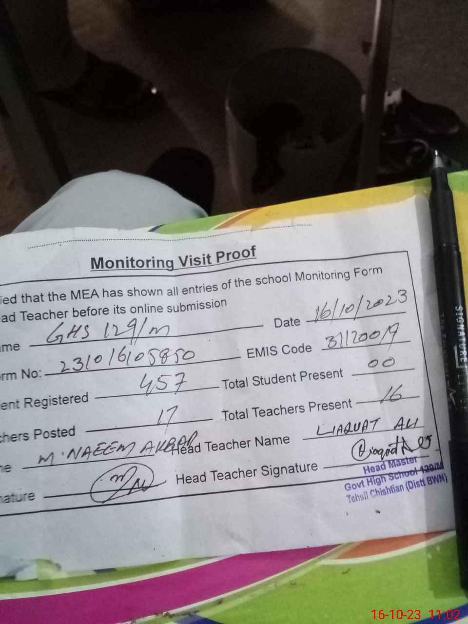| Attendance Register | Head Teacher | MEA with School | Visit Proof |