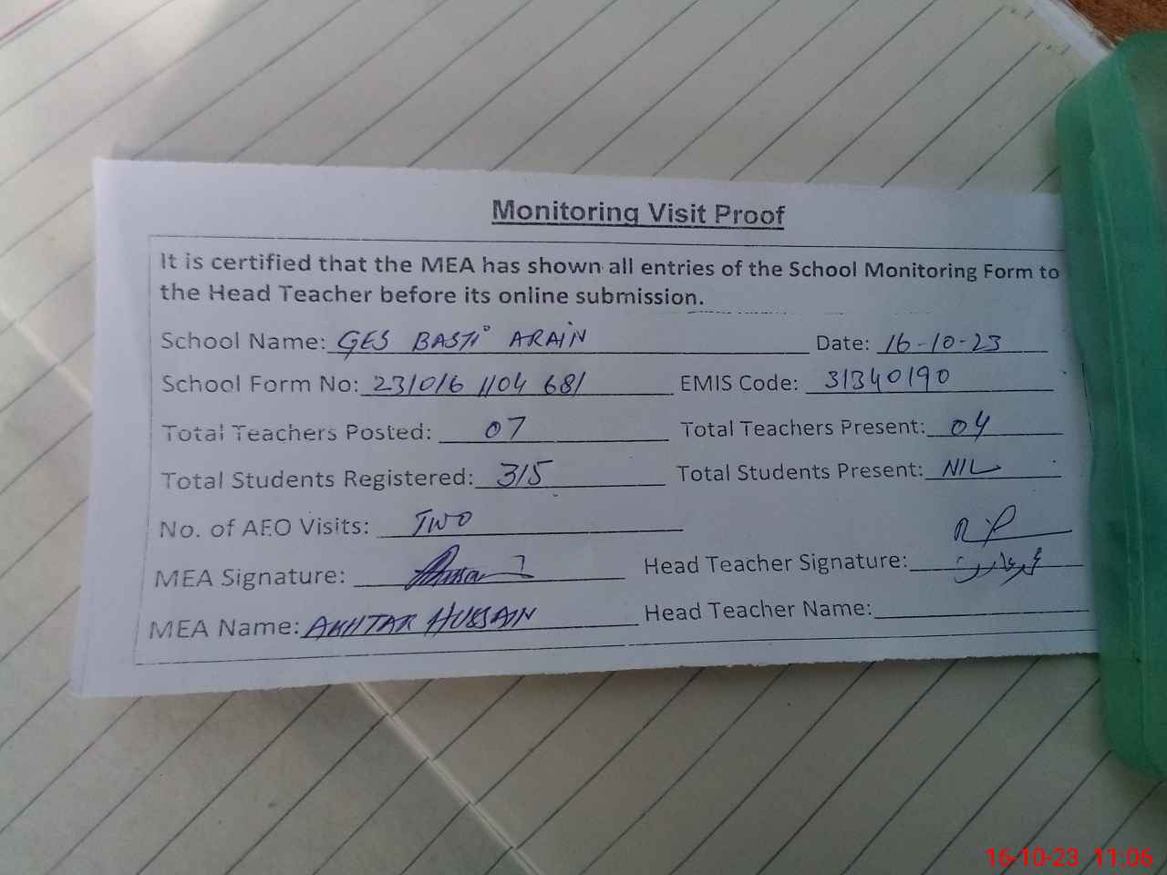 | EMIS Code: 31340190 | Name of School: GES BASTI ARAIN | |||