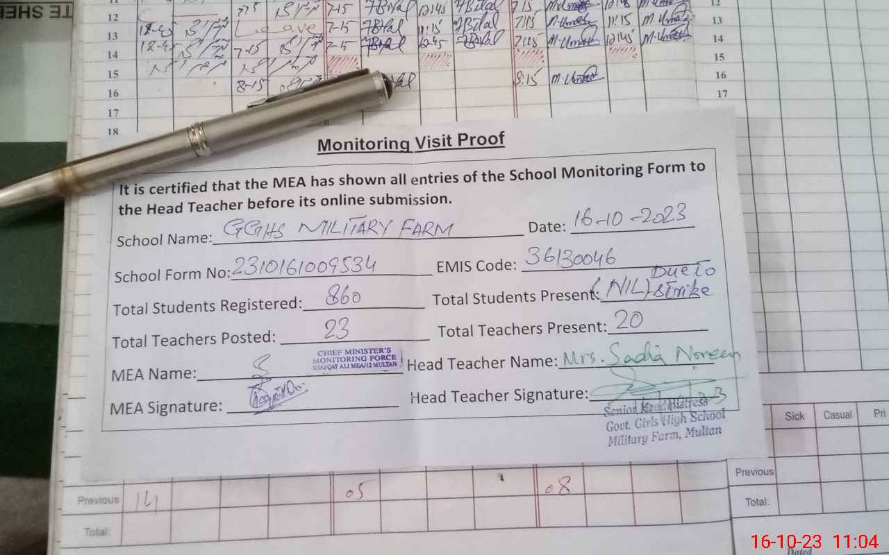 | EMIS Code: 36130046 | Name of School: GGHS MILITARY FARM MULTAN | |||