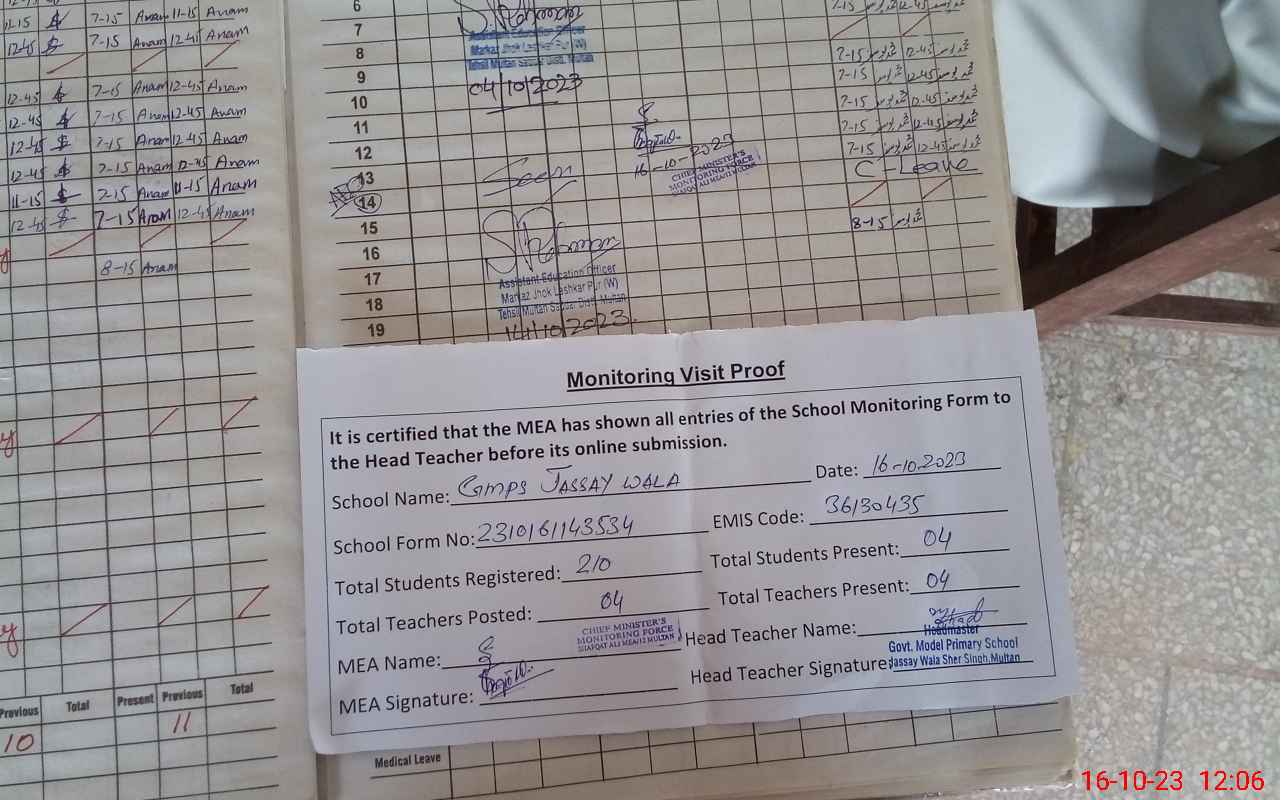 | EMIS Code: 36130435 | Name of School: GMPS JASSAY WALA MULTAN | |||