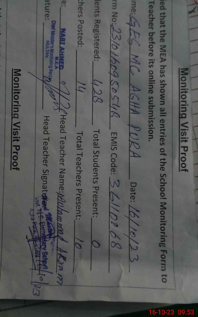 | EMIS Code: 36110068 | Name of School: GES MC AGHA PURA OUTSIDE DEHLI GATE MULTAN | |||