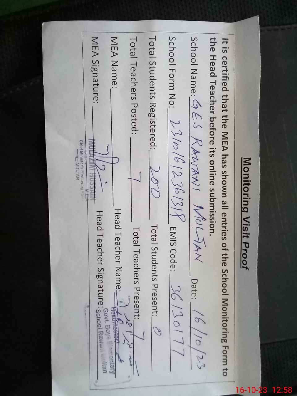 | Certified that this School was Inspected by the Undersigned MEA/DMO Today and the Information Stated Above is as Per Record. | |||||
