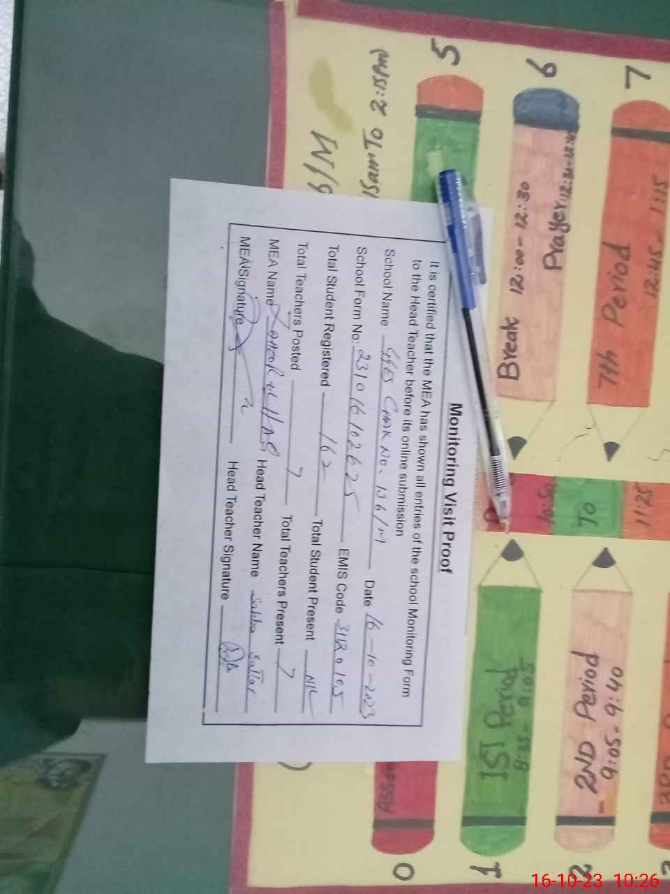 | Attendance Register | Head Teacher | MEA with School | Visit Proof |