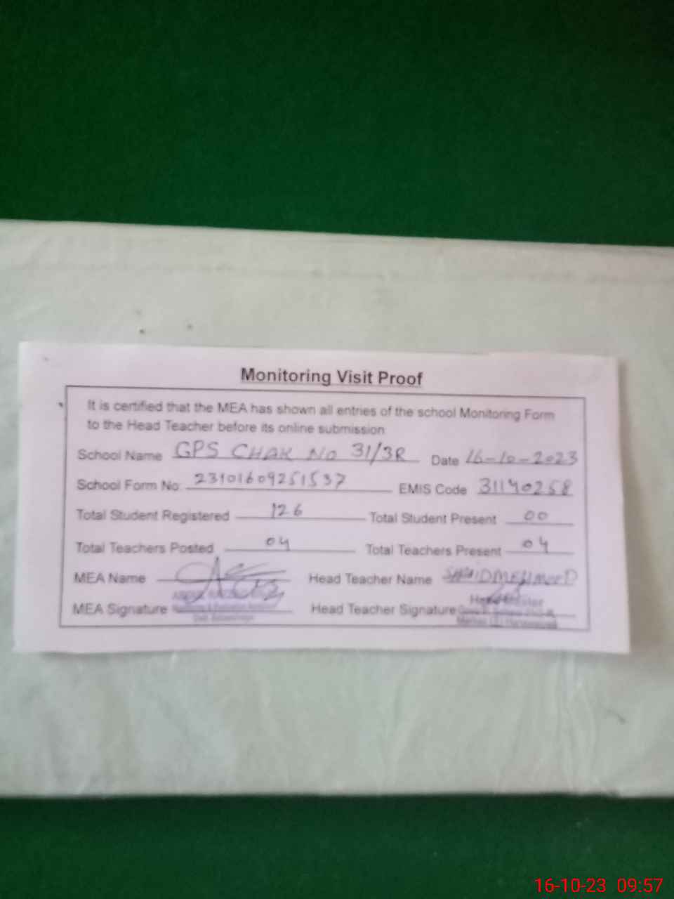 | Attendance Register | Head Teacher | MEA with School | Visit Proof |