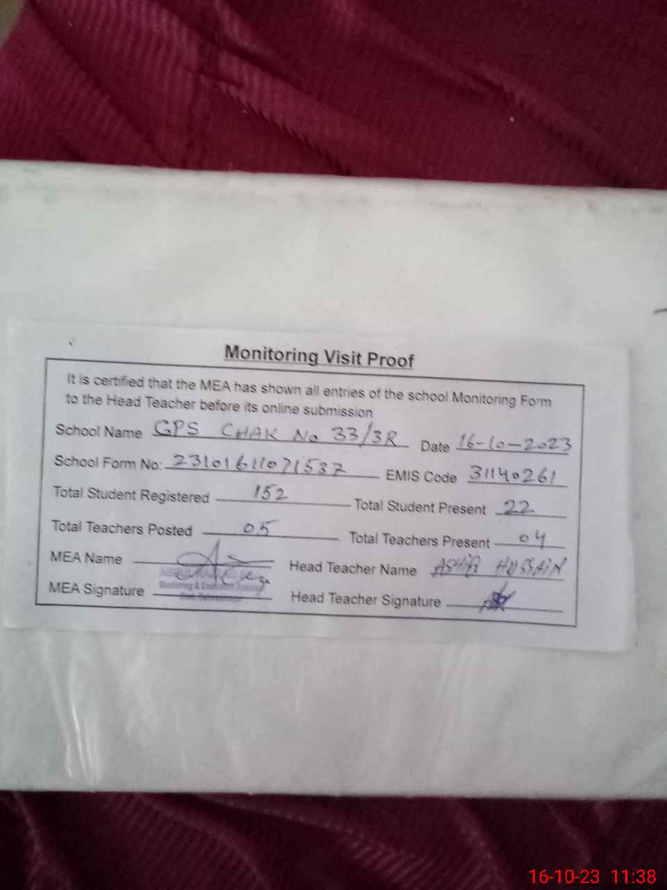 | EMIS Code: 31140261 | Name of School: GPS CHAK NO.33/3-R AB | |||