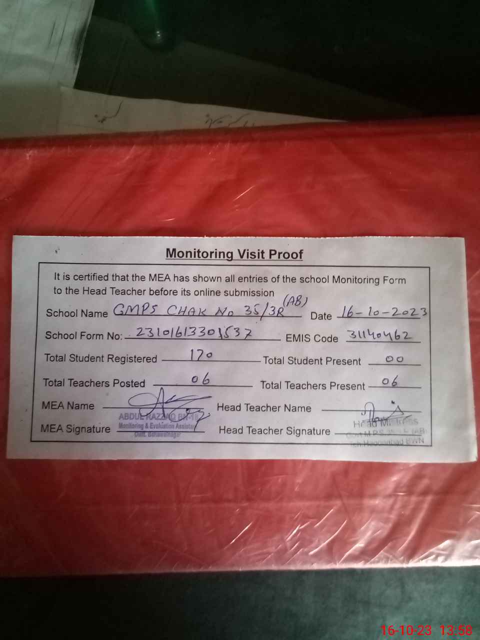 | EMIS Code: 31140462 | Name of School: GMPS CHAK NO 35/3-R AB | |||