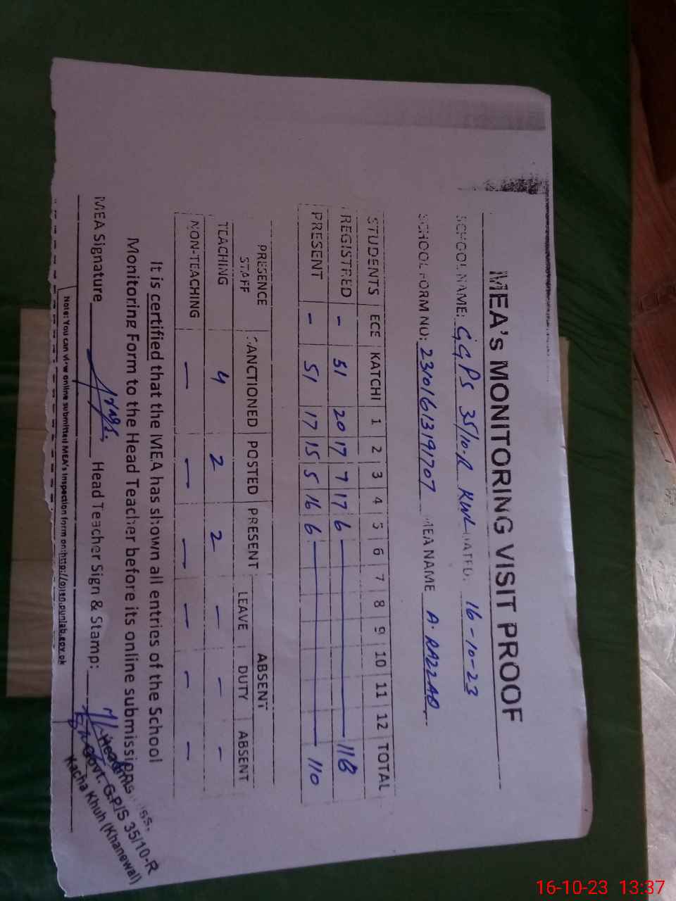 | Attendance Register | Head Teacher | MEA with School | Visit Proof |