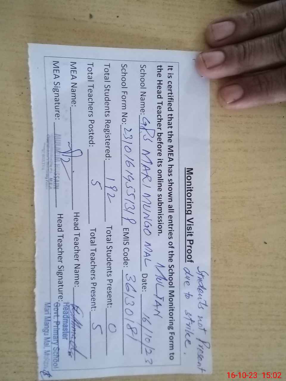 | Attendance Register | Head Teacher | MEA with School | Visit Proof |