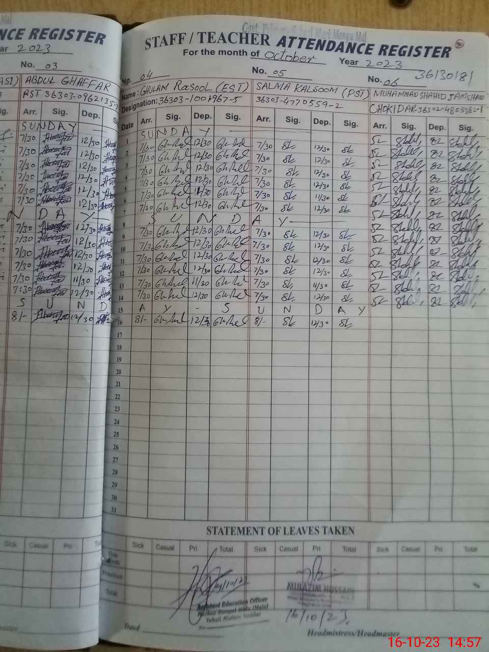 | CNIC | Full Name | Designation | R/C | Absence During Last Calender Month |