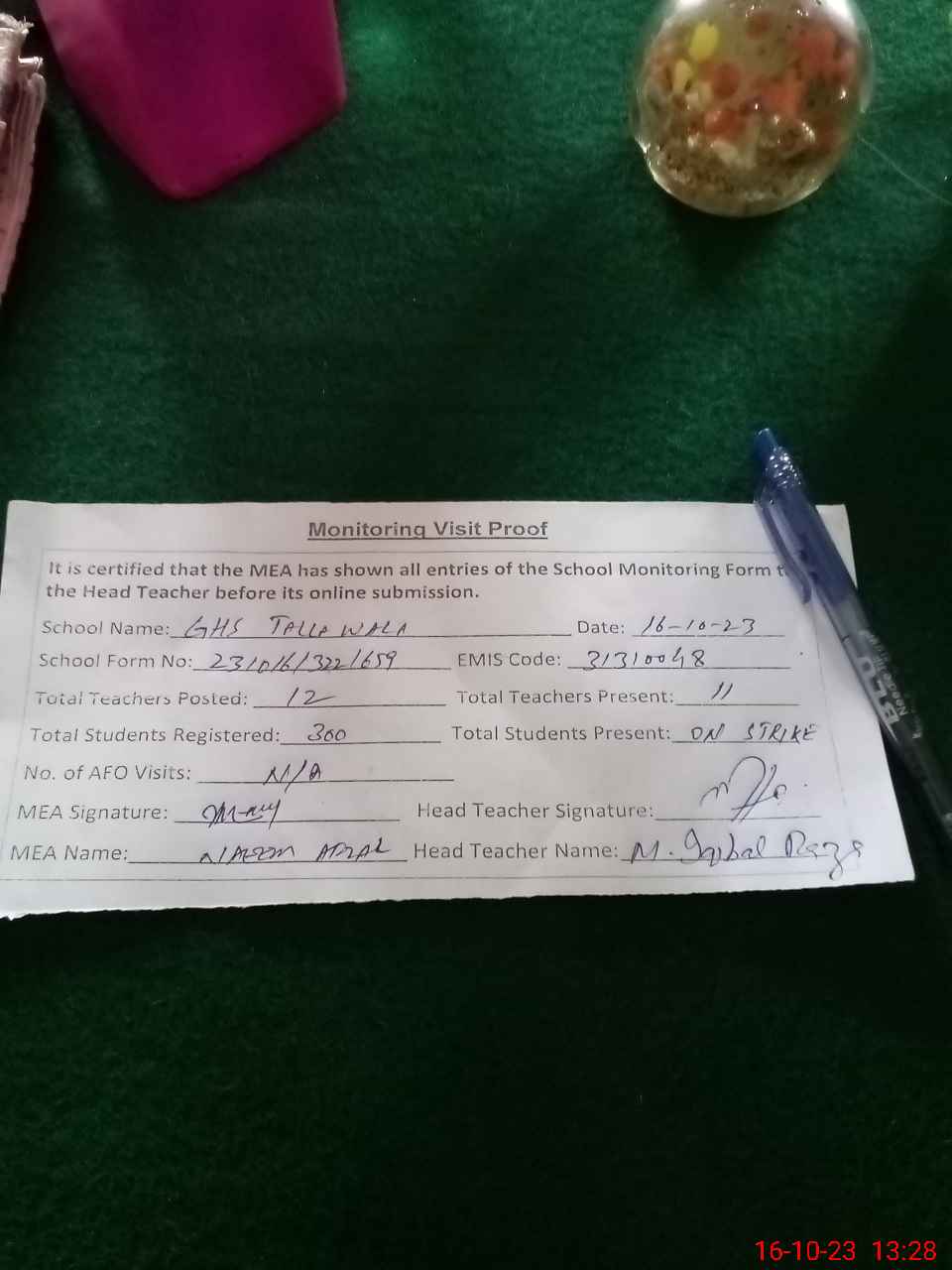 | Attendance Register | Head Teacher | MEA with School | Visit Proof |