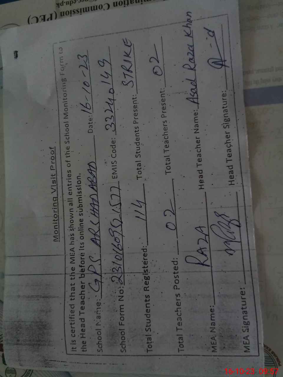 | EMIS Code: 33240149 | Name of School: GPS ARSHAD ABAD DURHI GONDEL | |||