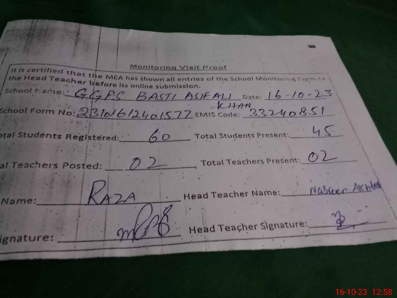 | Name: NA**** AK**** Designation: (School Headmaster's/Headmistress's) PST Phone/Cell Number: 03**** |