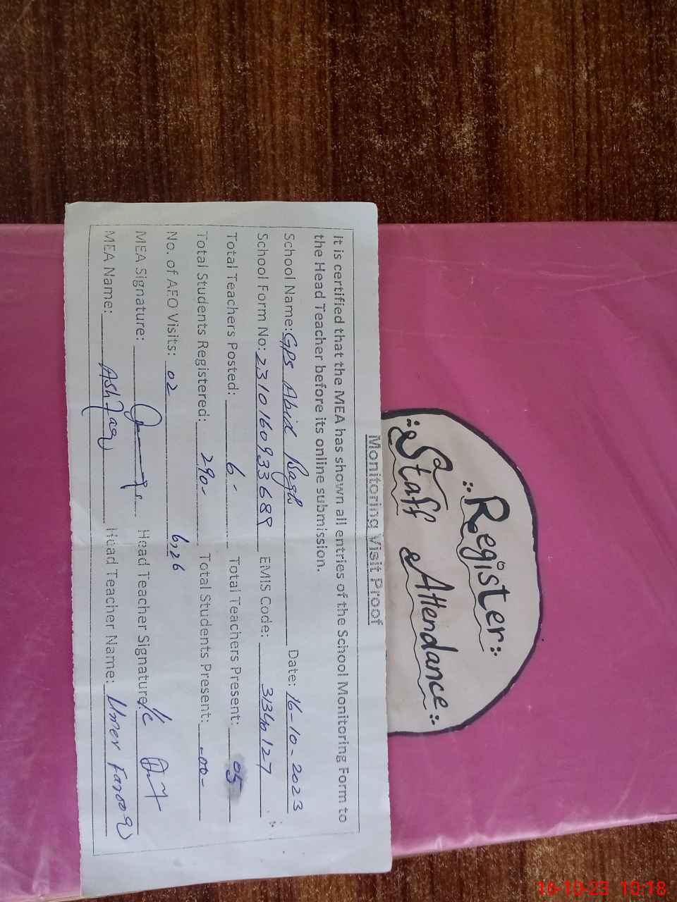 | Attendance Register | Head Teacher | MEA with School | Visit Proof |