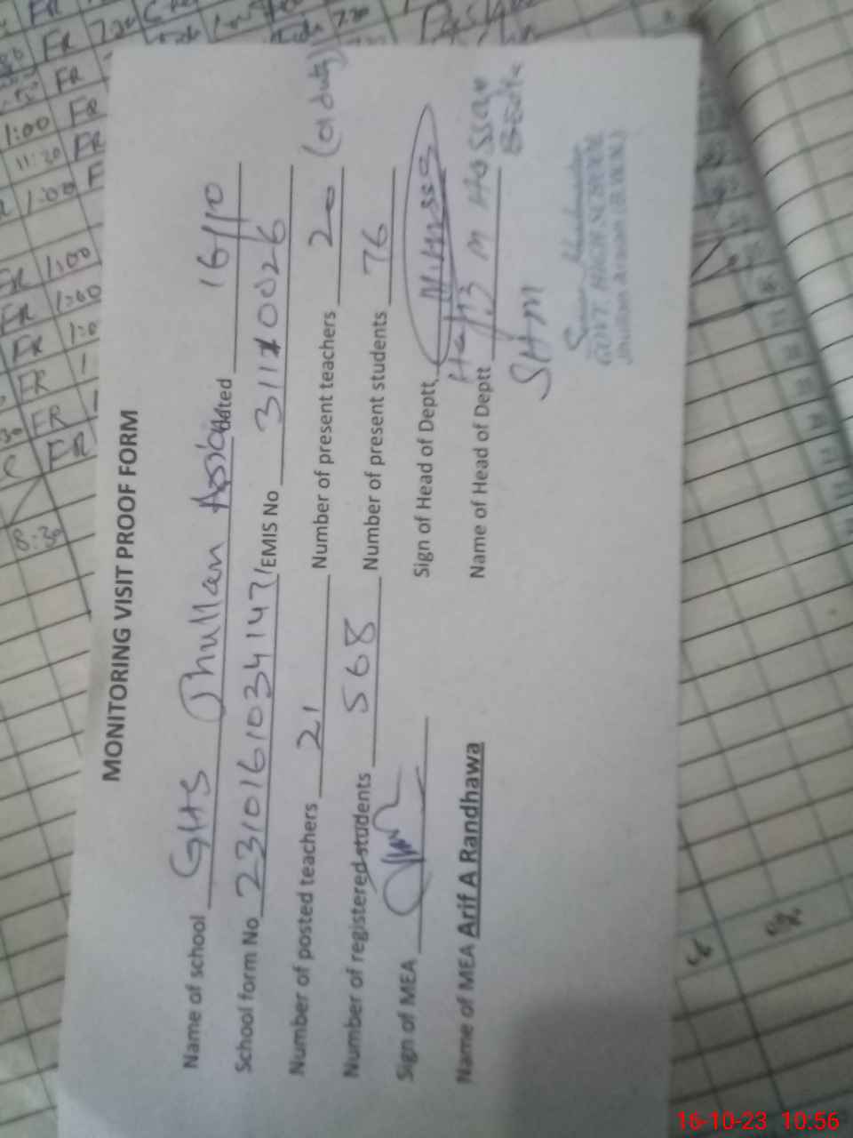 | Attendance Register | Head Teacher | MEA with School | Visit Proof |