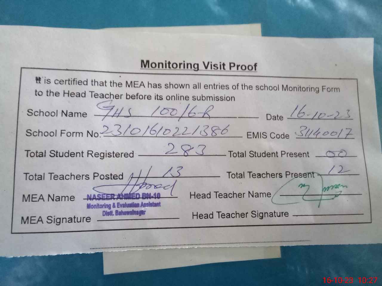 | Attendance Register | Head Teacher | MEA with School | Visit Proof |