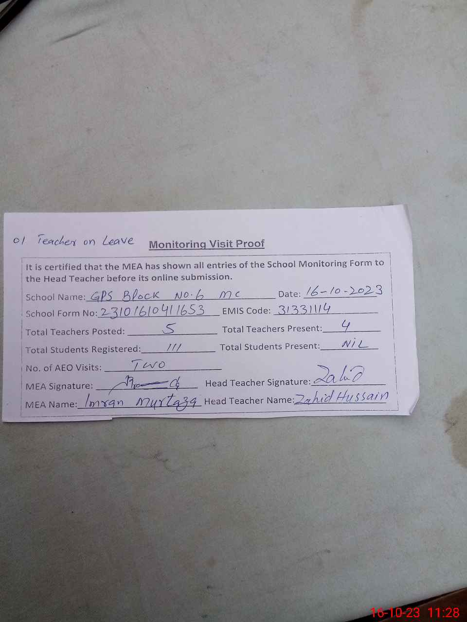 | Attendance Register | Head Teacher | MEA with School | Visit Proof |