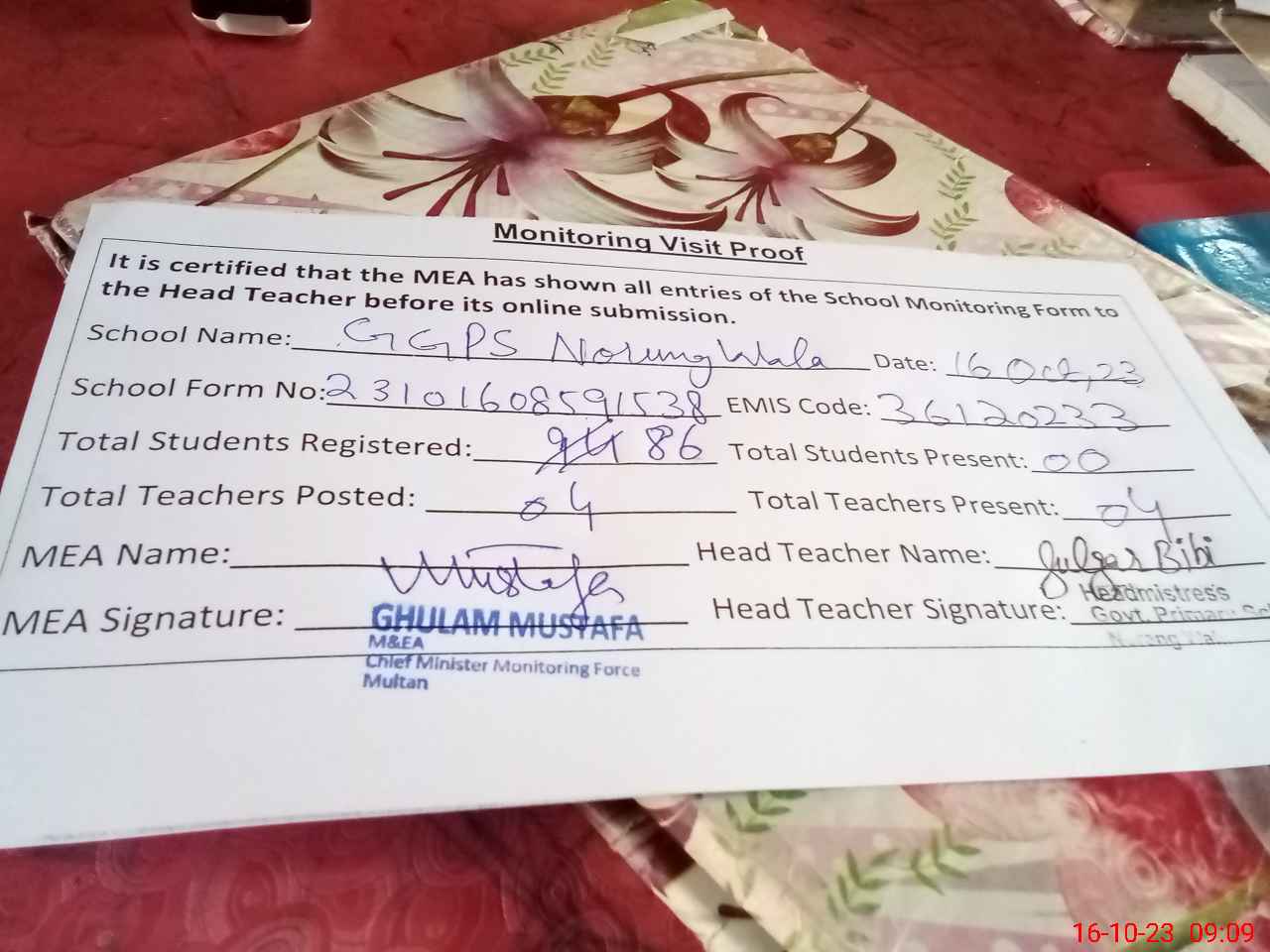 | EMIS Code: 36120233 | Name of School: GGPS NORUNG WALA SHUJABAD DISTT. MULTAN | |||