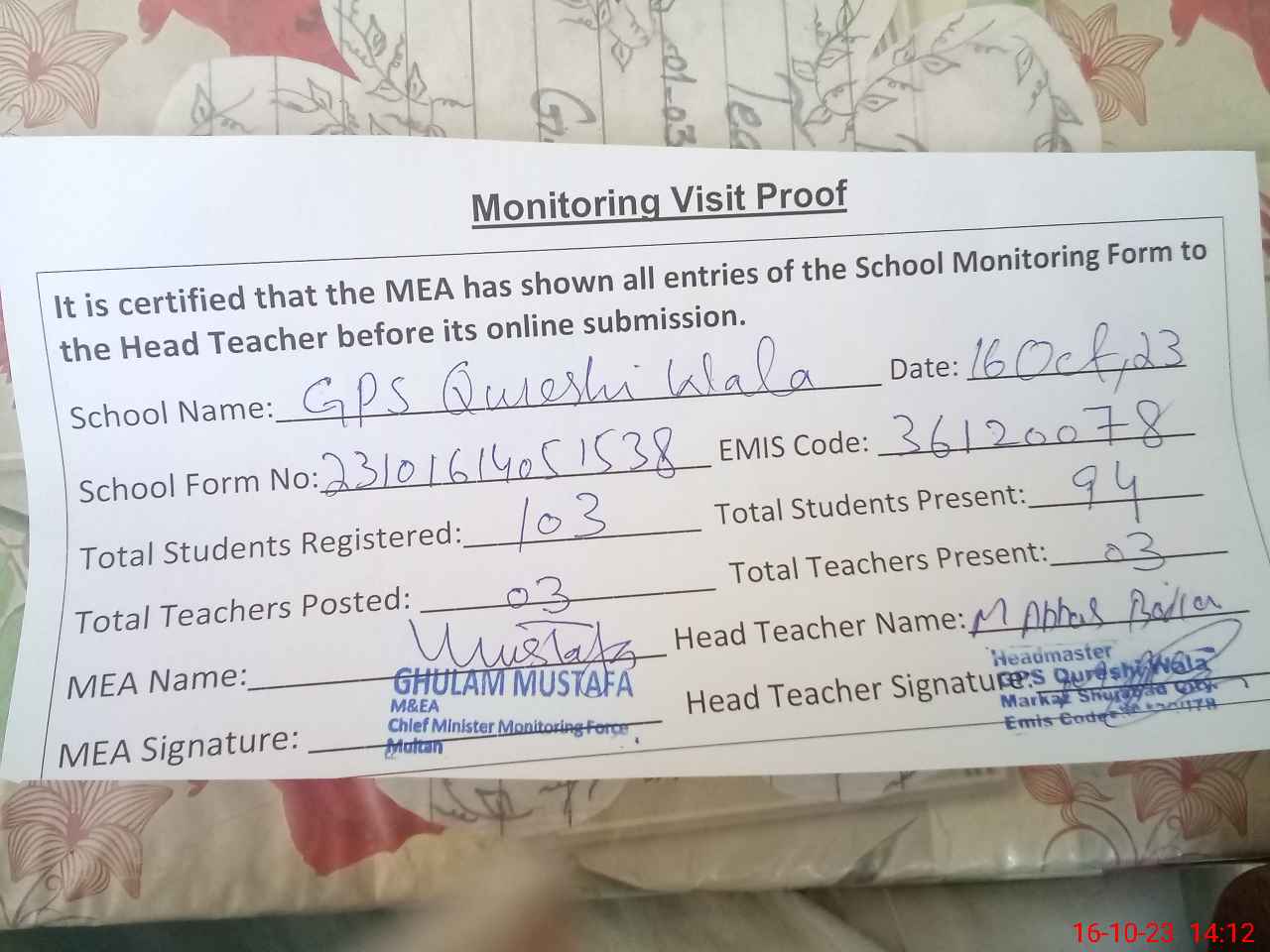 | Attendance Register | Head Teacher | MEA with School | Visit Proof |