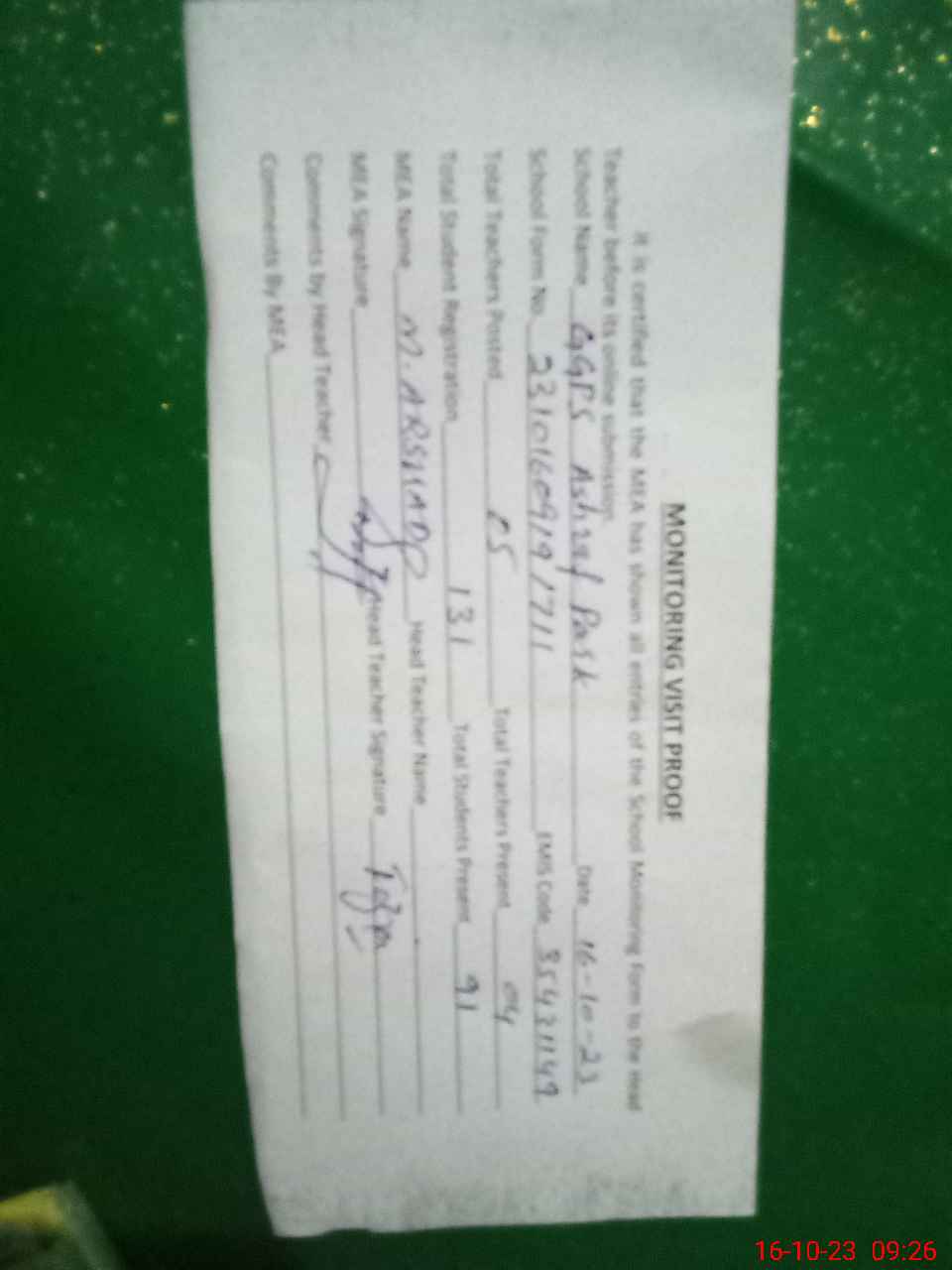 | Attendance Register | Head Teacher | MEA with School | Visit Proof |